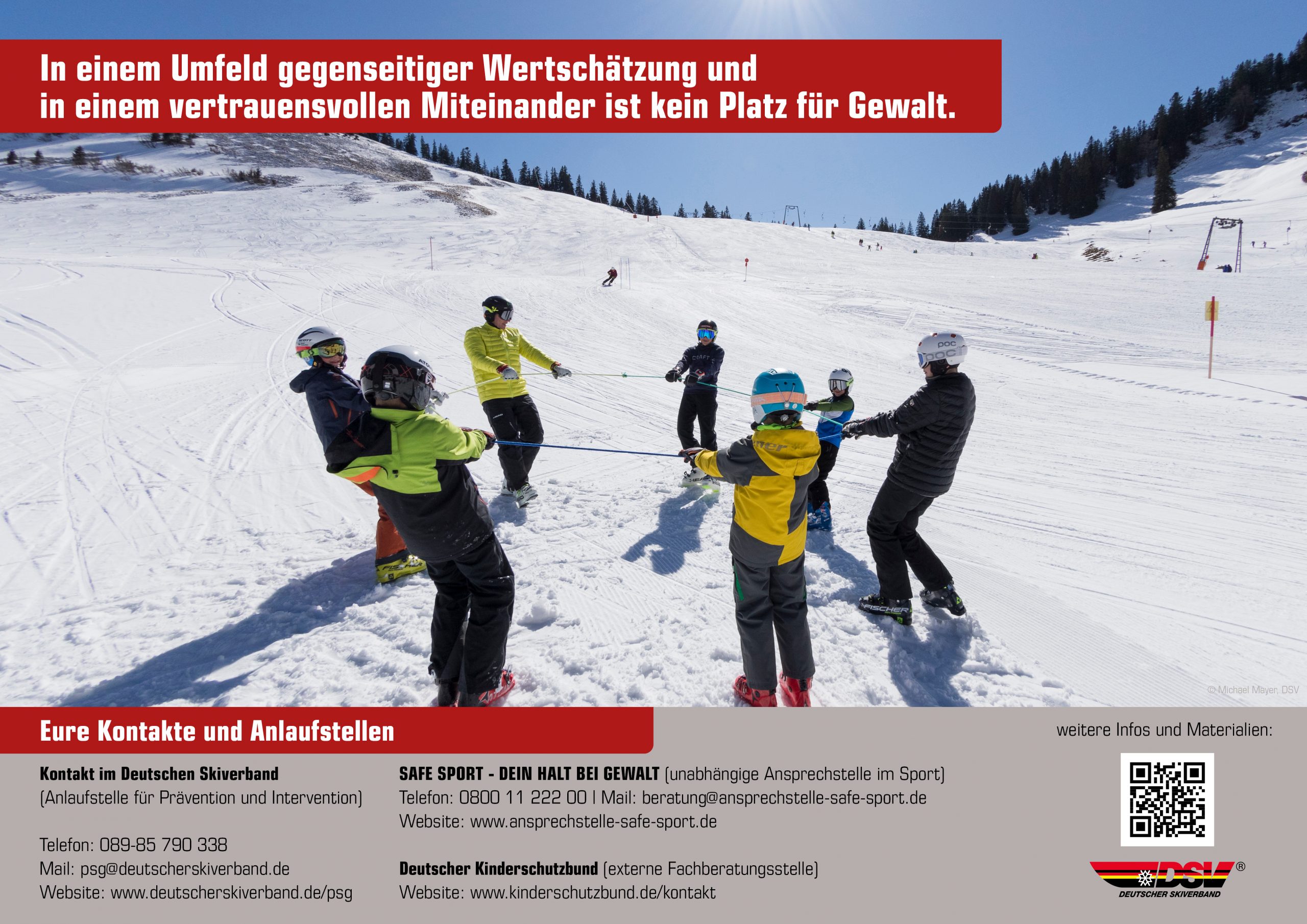 Mit dem DSV-Präventionsprogramm „Schneesport schaut hin“ fördern wir gemeinsame und gelebte Kultur „des Hinsehens und der gegenseitigen Wertschätzung“ und übernehmen Verantwortung. Mit einem sportlichen Umfeld, in dem sich alle Beteiligten sicher bewegen können und das Tätern keine Plattform bietet. Nut so kann unser Sport Spaß machen, und das soll auch so bleiben!